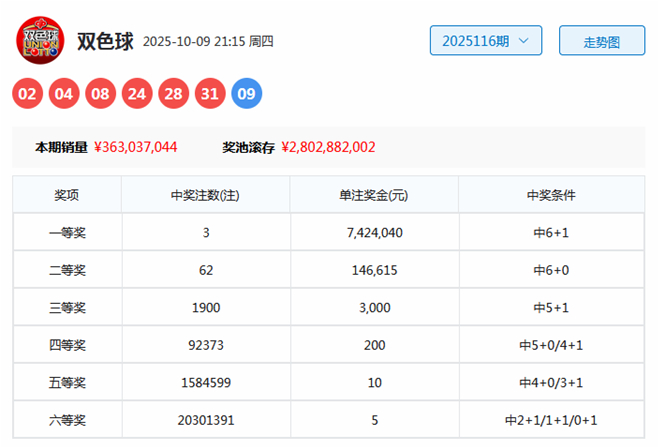 双色球第2025116期开出奖号为02、04、08、24、28、31+09。其中红球奇偶比为1:5,三区比为3:0:3,大小比为3:3,蓝球开出大号09。
