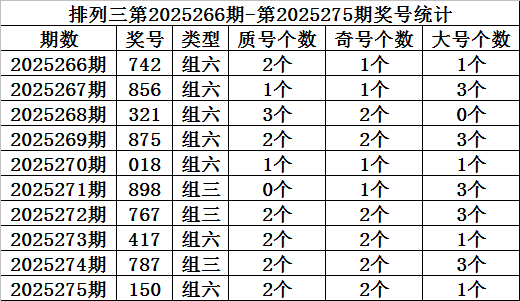 上期归来:枚举三第2025275期开奖:150,质合比为2:1,奇偶比为1:2,大小比为2:1。